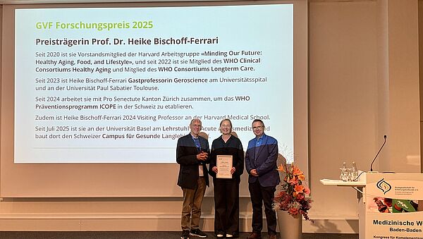 Die feierliche Verleihung des GVF Forschungspreises 2025 erfolgte im Rahmen der GVF-Fortbildungsveranstaltung auf der 58. Medizinischen Woche am 1. November 2025 in Baden-Baden. Prof. Bischoff-Ferrari hielt dort einen Vortrag zum Thema „Mikronährstoffe: Beitrag zu Longevity und Rejuvenation“.